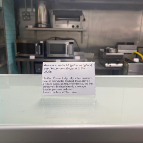 This investigation into the power of naming reaches another level of subtlety in The Museum (2022). Installed inside an abandoned café at London’s Billingsgate Market, the work didn’t just borrow space—it borrowed objects and transformed them. Small labels affixed to the café's existing items: a counter fridge, a microwave, and an oven. Each label listed the object's name, its function, and its role in the café. These were not altered, polished, or curated for aesthetic appeal—they were simply renamed. Their everyday use became their medium. A display fridge was now